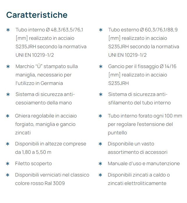 Resistenti, economici e versatili, i puntelli sono ideali per la costruzione di solai e per operazioni di puntellamento o ristrutturazione. I puntelli alta portata DIN EN 1065 vengono impiegati in tutto il mondo per operazioni di puntellamento e ristrutturazione. Per soddisfare ogni esigenza sono disponibili anche puntelli personalizzati per dealer e aziende di noleggio. Offriamo tre diverse classi di puntelli , che variano in base alla diversa capacità di carico : Classe A-B-C, le più leggere con portata varibile , Classe D con una portata garantita di 20 kN , e Classe E , la più robusta con i suoi 30 kN di portata. I puntelli DIN EN 1065 possono essere verniciati nel classico colore rosso Ral 3009 , zincati a caldo o elettoliticamente. In questo caso sono zincati elettroliticamente.