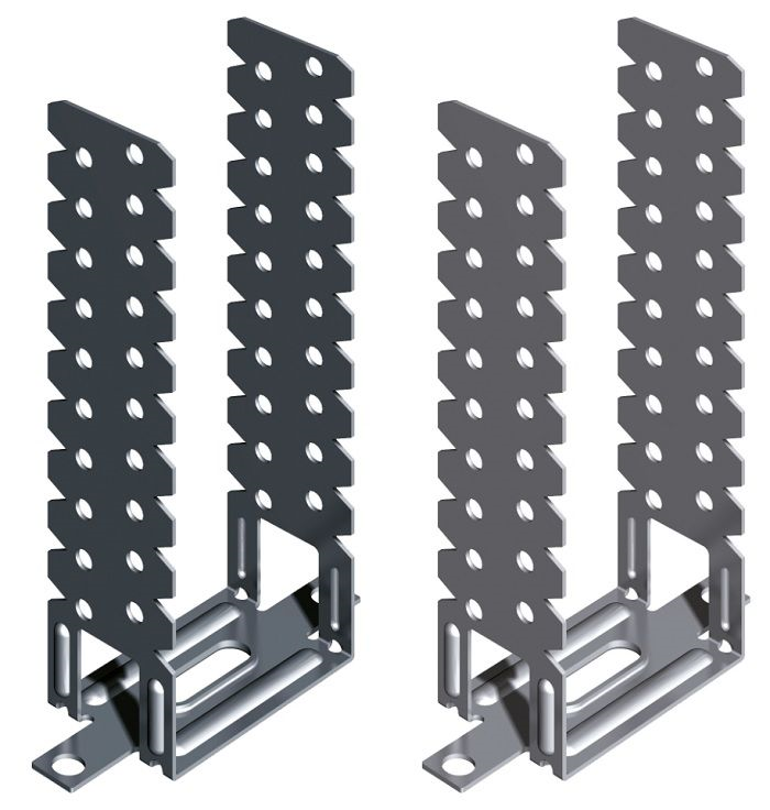 Staffa registrabile 50X120 mm in acciaio zincato utilizzata nella formazione di contropareti, funge da blocco e distanziatore dei profili dalla parete portante. La distanza dal bordo del profilo alla parete, varia da 30 a 120 mm.