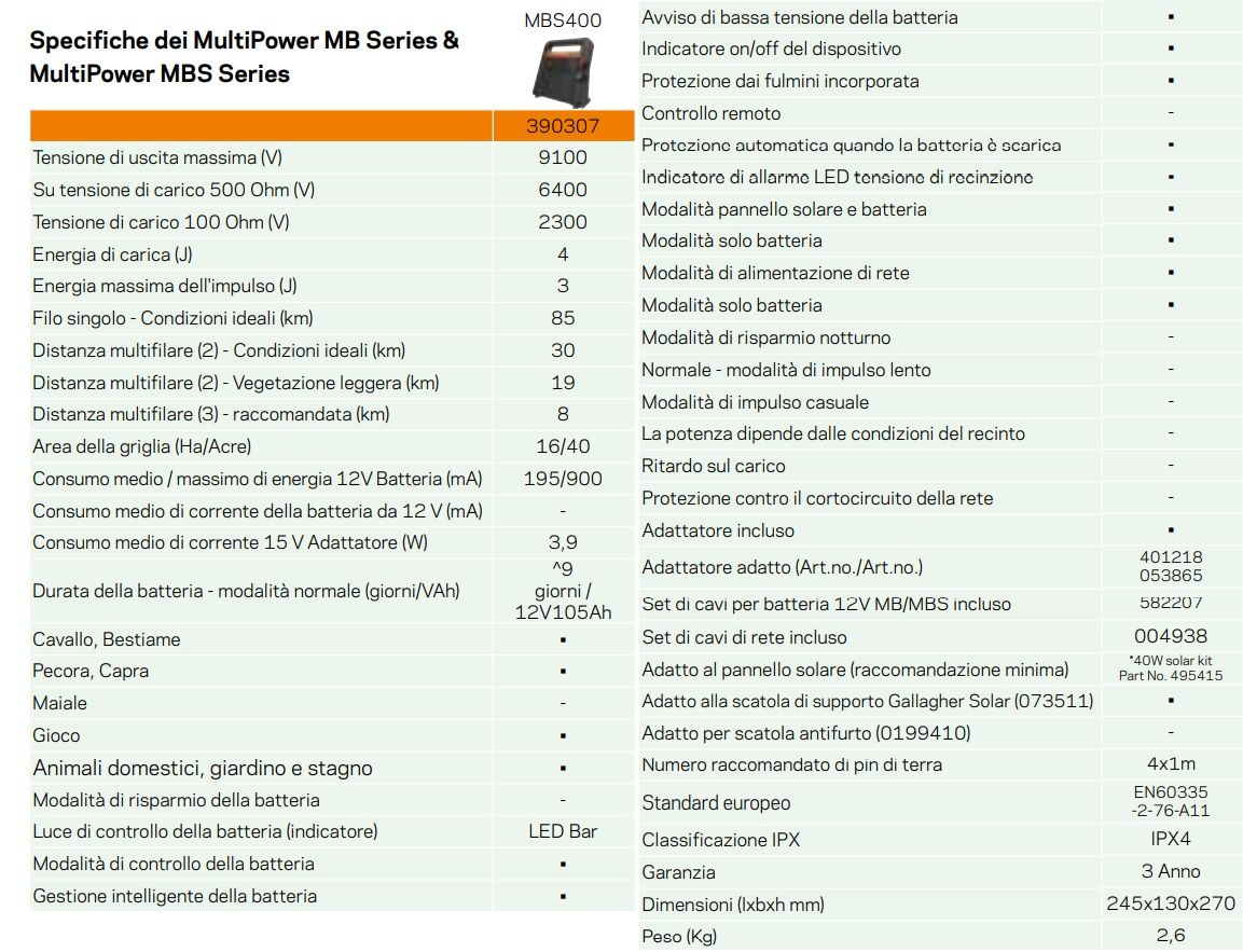 L’MBS400 è un elettrificatore multi-power 3 in 1. È indicato per essere utilizzato con pannello solare, batteria a 12 V o con rete elettrica a 230 V. È possibile selezionare la fonte di alimentazione con un pulsante e varie impostazioni. L’elettrificatore è indicato per recinzioni fino a 30 km, è dotato di funzione di controllo della batteria e parafulmine incorporato. Comprende un set di cavi di connessione.