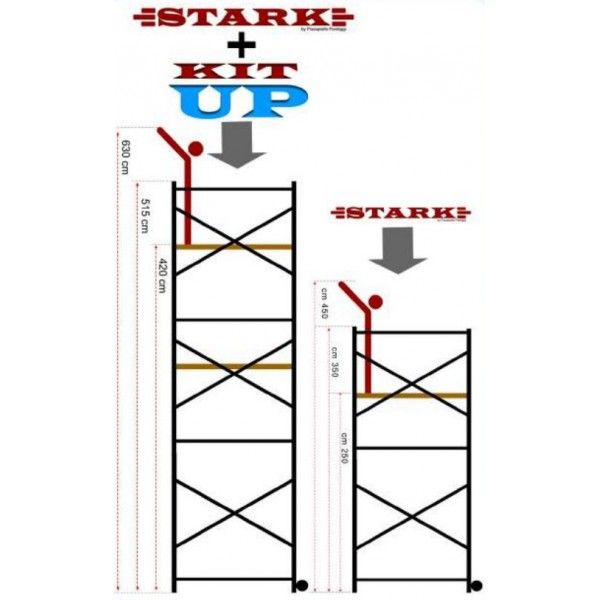 Il kit alzata UP consente al trabattello VENERE di raggiumgere un'altezza di lavoro di 6,40 mt. IL kit è composto da : 2 spalle da 150 cm 2 Orizzontali di congiunzione 2 Diagonali con ganci rapidi 4 Aste stabilizzatrici telescopiche 1 Piano di lavoro 62 x 150 cm