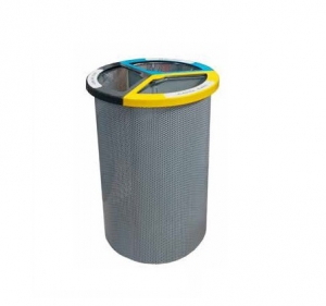 Cestino per la raccolta differenziata ideale per grandi strutture come aeroporti, centri commerciali, ecc… Struttura cilindrica esterna composta in lamiera d’acciaio forata calandrata sp.2 mm con fondo in lamiera d’acciaio sp.3mm che poggia su una base circolare in piatto calandrato 50x5 mm. Il contenitore è diviso internamente in 3 settori tramite pannelli in lamiera d’acciaio sp.15/10 saldati ad un sostegno centrale in tubo Ø30 mm, ciascuna sezione è completa di reggi - sacco in trafilato d’acciaio sp.6 mm. Il coperchio apribile in lamiera sp.20/10 tagliata al laser e ribordata mediante tornitura viene finito con trattamenti di zincatura e verniciatura a liquido in 3 colori e scritta identificativa secondo la divisione per la raccolta differenziata. Tutta la viteria è in acciaio inox. Non avendo coperchio di chiusura è preferibile l’uso in ambienti interni o protetti. Su richiesta può essere predisposto per il fissaggio al suolo.