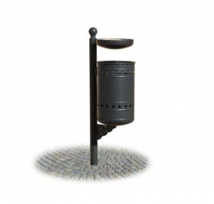 Cestino realizzato in lamiera sagomata d'acciaio zincato dimensioni cm 30 x 51. Fondo del cestello realizzato mediante disco di lamiera stampato. Palo di sostegno realizzato in tubo tondo d'acciaio zincato con all'apice elemento decorativo a sfera in fusione. Mensola di sostegno del cestello realizzata in lamiera sagomata con tecnologia laser. Tettuccio/posacenere realizzato con disco di lamiera stampato sp. 30/10. Sistema di svuotamento mediante sgancio con chiave a brugola fornita in dotazione.