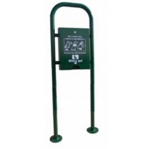 Il distributore, dim. 286x369x51 mm, è costruito in lamiera e dispone di una fessura sul lato inferiore che consente una facile presa del sacchetto. È dotato di una chiave che consente l’apertura a libro nella parte superiore per l’inserimento dei sacchetti. Il supporto in tubolare D.38 mm altezza totale 1800 mm è dotato di piedini flangiati per ancoraggio con tasselli.