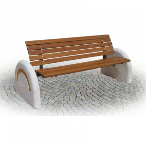 Panchina composta da supporti in calcestruzzo bianco tipo travertino trattato antidegrado e rompitratta in tubo tondo d’acciaio zincato Ø mm. 60. Sostegni per seduta e schienale realizzati in lamiera sagomata con tecnologia laser sp. 60/10. Seduta e schienale realizzati mediante doghe in legno esotico sez. mm. 70 x 30 x 1700 opportunamente trattato. Le parti in acciaio zincato subiscono dapprima processo di pre-trattamento di sgrassaggio delle impurità attraverso soluzioni a vapori, successivamente asciugate e sottoposte a operazioni di verniciatura mediante pistole elettrostatiche che ricoprono i pezzi di vernice di polvere allo stato farinoso. Successivamente il manufatto è sottoposto a polimerizzazione in forno, ovvero, processo che permette alla polvere di solidificarsi cocendo ad una temperatura di 180/200° C in un forno a circolazione di aria calda. I pezzi usciti dal forno vengono raffreddati naturalmente. Le polveri utilizzate nel processo di verniciatura sono atossiche secondo normative vigenti. Colorazione RAL a discrezione del cliente.