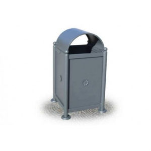 Telaio realizzato in lamiera d’acciaio zincato sp. 10/10 dotato suogni lato di fiori decorativi in fusione d’acciaio dotato internamente di anello reggi sacco e di tettuccio apribile in lamiera d’acciaio opportunamente sagomata.
