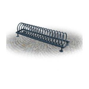 Portabiciclette composto da correnti in tubo tondo d’acciaio zincato Ø mm. 40 che supportano la spirale realizzata in tubo tondo d’acciaio zincato Ø mm. 20. Piedi fissi dotati di piastre tonde per fissaggio al suolo. Trattamento di verniciatura a polveri elletrostatiche in colorazione RAL a scelta della D.L.