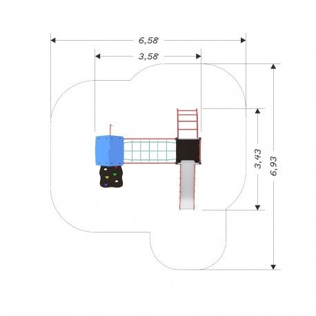 Altezza partenza scivolo: cm 120 Altezza totale: cm 321 Altezza di caduta: cm 120 Area d’ingombro: cm 345 x 361 Spazio minimo: cm 695 x 661 x h 471 Area d’impatto: mq 35 Età d’uso consigliata: 3/14 anni