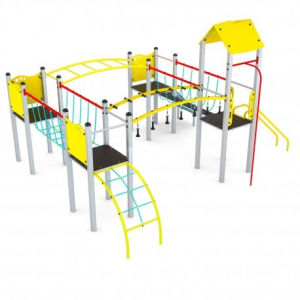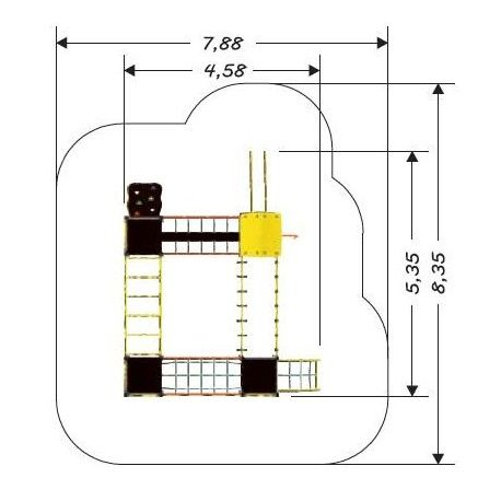4 Piani di calpestio in piastra PEHD anti-slittamento 21 mm 1 arrampicata “muro” 1 tetto in PEHD 1 sartia di risalita con montanti curvi in acciaio zincato e verniciato rete realizzata con funi tipo hercules con anima in acciaio e rivestimento in poliammide 2 ponti realizzati con funi tipo hercules con anima in acciaio e rivestimento in poliammide 1 pertica curva 1 passaggio aereo ad anelli 1 passaggio aereo a pioli 1 spalliera orizzontale