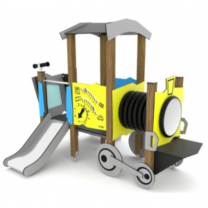 1 scivolo h=60 cm con pista in acciaio inox fianchi in polietilene ad alta densità. 1 scaletta h=60 cm pannelli di tamponamento in PEHD piani di calpestio realizzati in multistrato marino con film fenolico antiscivolo 1 tetto 1 pallottoliere 1 tunnel 1 cannocchiale 1 pannello ludico 1 pannello balcone