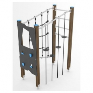 Composizione ginnica a 4 lati, gioco da esterni palestra realizzata con montanti sezione 9x9 cm in lamellare di pino scandinavo trattato in autoclave con staffa a bicchiere punta in acciaio zincato per l’ancoraggio al terreno. Serie Vincy Play.