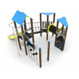 Castello tre torri, scivolo pista in acciaio inox e arrampicate con Montanti sezione 9x9 cm in lamellare di pino scandinavo trattato in autoclave con staffa a bicchiere punta in acciaio zincato per l’ancoraggio al terreno.