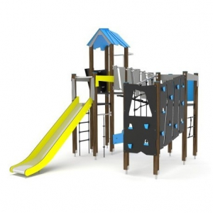Castello tre torri, scivolo pista in acciaio inox e arrampicate con montanti sezione 9x9 cm in lamellare di pino scandinavo trattato in autoclave con staffa a bicchiere punta in acciaio zincato per l’ancoraggio al terreno.
