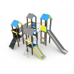 4 torri con scivolo pista in acciaio inox con Montanti sezione 9x9 cm in lamellare di pino scandinavo trattato in autoclave con staffa a bicchiere punta in acciaio zincato per l’ancoraggio al terreno.