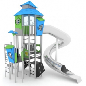 Composta da: 1 scivolo con pista in acciaio inox e fianchi in polietilene HDPE 1 scivolo a tubo elicoidale pista in acciaio inox 1 pannello labirinto rotante 1 pannello sonoro gioco tamburi 1 pannello oblò Pannelli di tamponamento in lastre di HDPE 1 fune d’arrampicata 1 scaletta in corda 1 pannello d’arrampicata con prese 1 rete d’arrampicata 1 seduta a dondolo a fascia