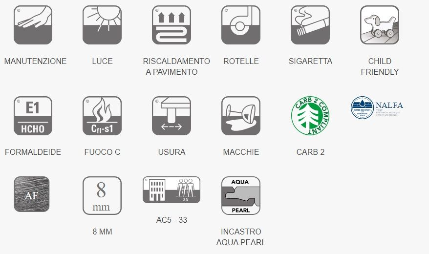 Caratteristiche tecniche: Superficie: Strato protettivo in corindone (ossido di alluminio) Decorativo : Carta melaminica o stampa diretta Supporto : HDF Strato Inferiore : Carta controbilanciante