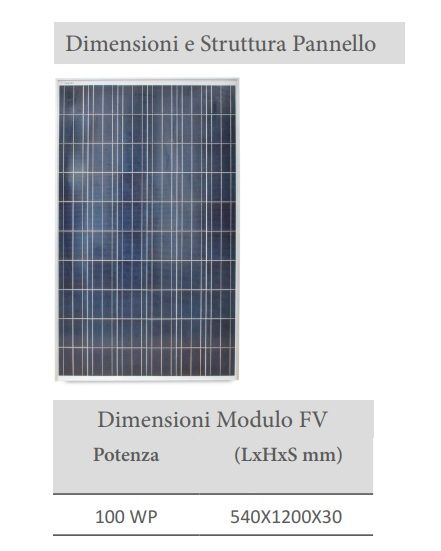 Pannello FV: 100 Watt picco, dimensioni: 540 x 1200 x 30 mm;