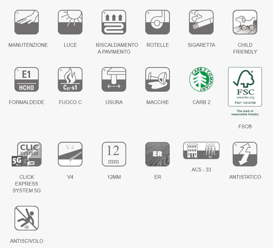 Caratteristiche tecniche: Superficie: Strato protettivo in corindone (ossido di alluminio) Decorativo : Carta melaminica o stampa diretta Supporto : HDF Strato Inferiore : Carta controbilanciante