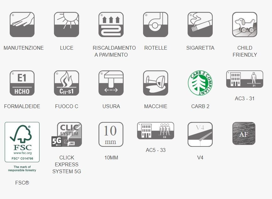 Caratteristiche tecniche: Superficie: Strato protettivo in corindone (ossido di alluminio) Decorativo : Carta melaminica o stampa diretta Supporto : HDF Strato Inferiore : Carta controbilanciante