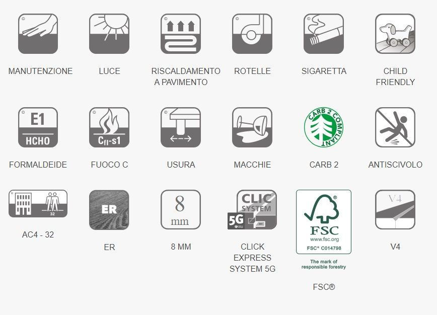 Caratteristiche tecniche: Superficie: Strato protettivo in corindone (ossido di alluminio) Decorativo : Carta melaminica o stampa diretta Supporto : HDF Strato Inferiore : Carta controbilanciante