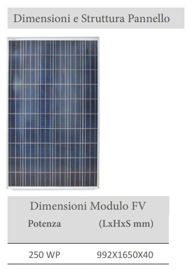 Pannello FV: 250 Watt picco, dimensioni: 992 x 1650 x 40 mm;