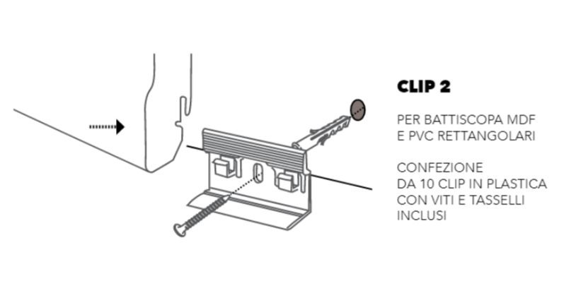 Confezione 50 pz clip in plastica per fissaggio con viti e tasselli inclusi. Specifica per battiscopa MDF e PVC rettangolari.