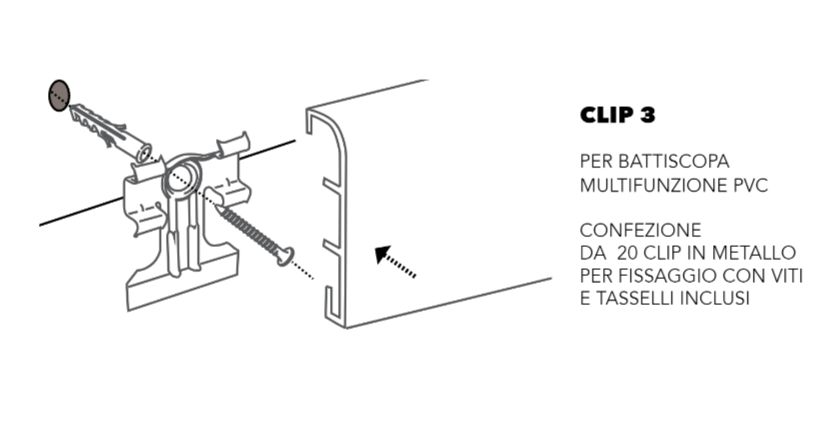 Confezione 100 pz clip in metallo per fissaggio con viti e tasselli inclusi. Specifica per battiscopa multifunzione PVC.