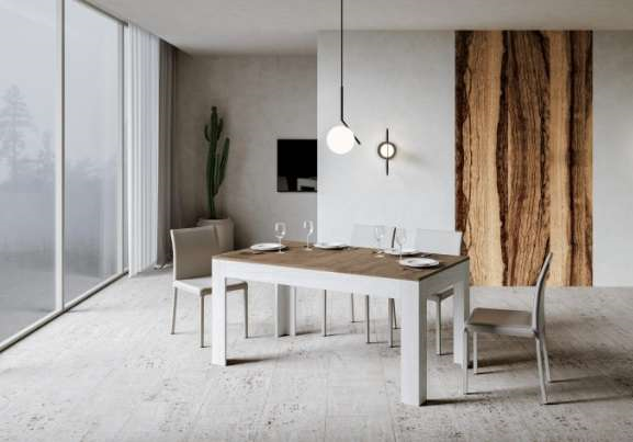 Tavolo Bibi Mix 90×160 + 60 Gambe Sagomate Base Bianco Frassino Piano Noce / Quercia Natura