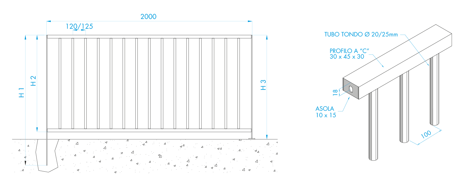 Linea Missouri , una recizione modulare per chi ama lo stile moderno , pulito ed essenziale. E' una recinzione modulare che funge da elemento di arredo urbano in contesti industriali e commerciali , in cui si amalgama con l'ambiente esterno ; viene utilizzata anche in ambienti residenziali da chi ama lo stile moderno , pulito ed essenziale. Realizzata con profili orizzontali a 'C' 30x45x30 mm e con profili verticali in tubi tondi diametro 20 mm saldati direttamenti ai profili a 'C'.