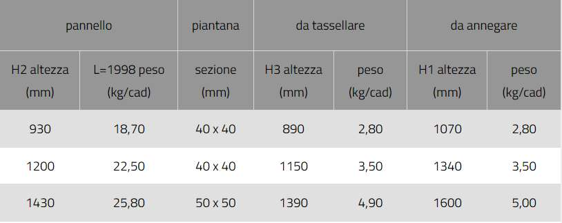 NB: Per la misura H 1390 mm la sezione è 50x50mm