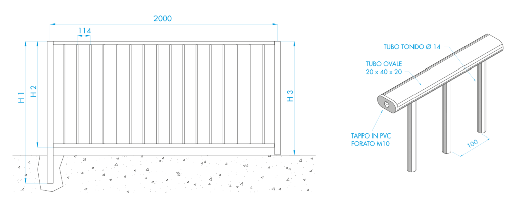 Realizzata con profili orizzontali in tubo ovale 40x20 mm , con profili verticali in tubo diametro 14 mm , saldati ai tubolari ovali.