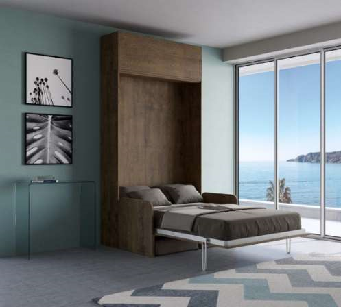 La composizione è proposta con letto a parete a scomparsa verticale Kentaro matrimoniale con divano Sofà e una capiente e spaziosa pensile appartenente alla linea Isoka.