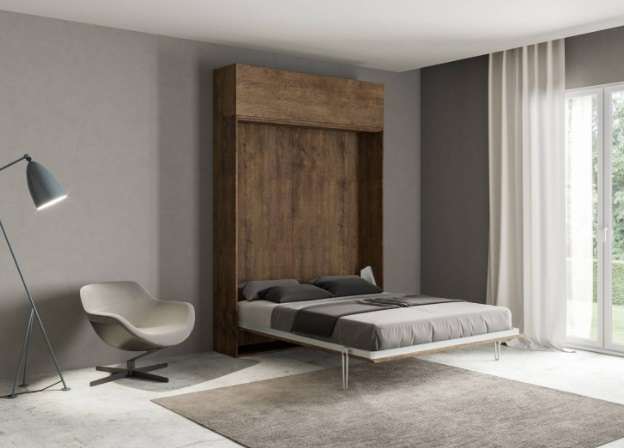 Letto a una piazza e mezzo a scomparsa verticale Kentaro abbinato con pensile orizzontale superiore ad apertura a vasistas Isoka. Ideale per contesti in cui ogni singolo centimetro fa la differenza.