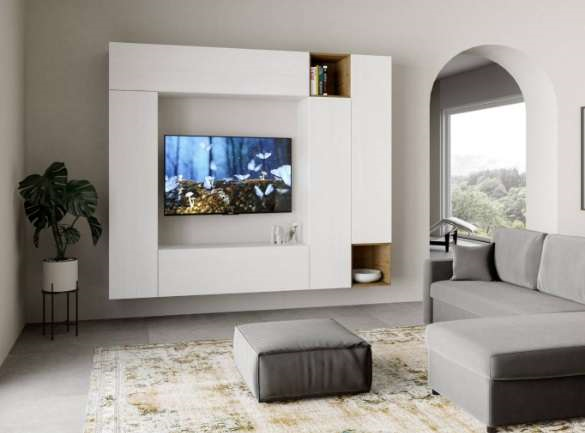 La parete attrezzata Isoka A32 è composta da tre elementi verticali, due elementi orizzontali e due cubi aperti, pensati per incorniciare la tua TV.