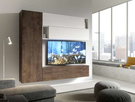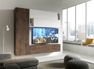 La parete attrezzata Isoka A34 è composta da tre elementi orizzontali accostati a un elemento verticale più capiente. Due cubetti aperti rendono la composizione più sfiziosa.