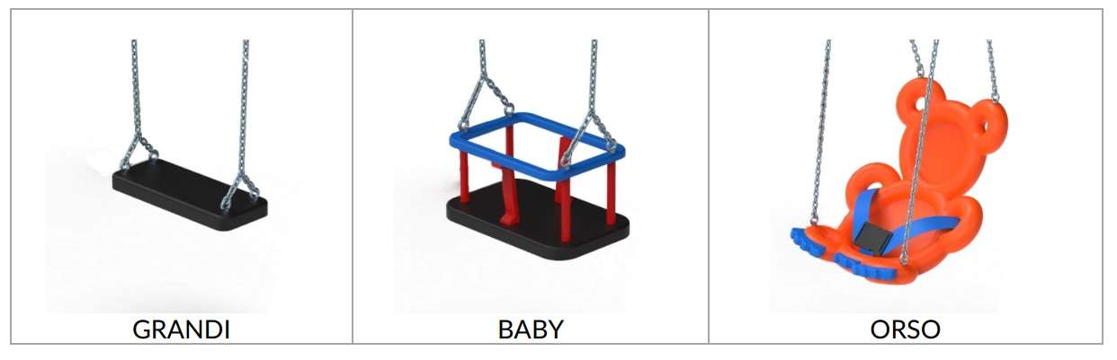 Seggiolini e componenti varie in accordo alla normativa UNI EN 1176 e relative.