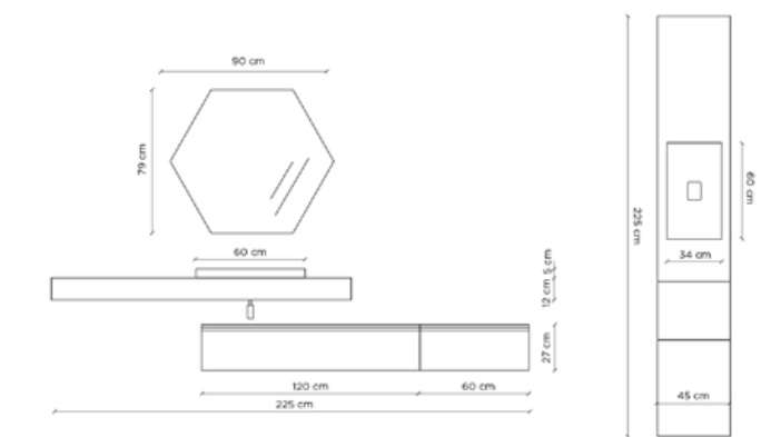 - Base sospesa in melaminico spessore 18 mm, con un cassettone in metallo , chiusura soft close, finitura liscia 120x45x27cm,
