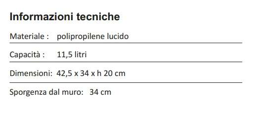 Dotazione Kit di fissaggio a parete Viti a testa esagonale Coprivite Doppia staffa di supporto Sifone con tubo estensibile con dado in plastica 1”1/4 e uscita Ø32 e Ø40 Piletta con troppopieno e tappo di copertura Griglia appoggiatutto su richiesta