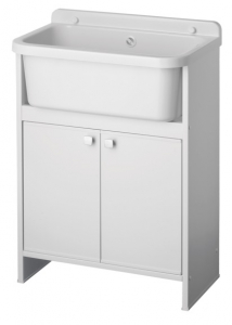 Mobile lavatoio salvaspazio in resina PVC rinforzata (indicato anche per esterno). Pratico vano portaoggetti con ripiano interno, ante a chiusura magnetica.