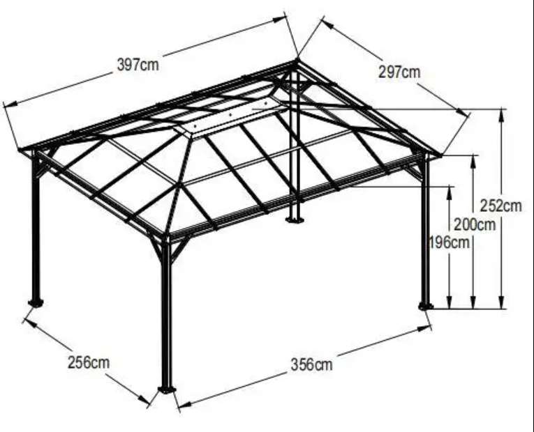 - Dimensioni complessive: L400xL300xA251 cm - Altezza ingresso: 195 cm - Dimensioni base: L356xP256 cm - Supporto: 76x76x1,1 mm e Traversa: 100x60,5x1,0 mm - Telaio in alluminio da 1,2-1,5 mm con rivestimento a polvere - Pannello in policarbonato a doppia parete da 6 mm con protezione UV