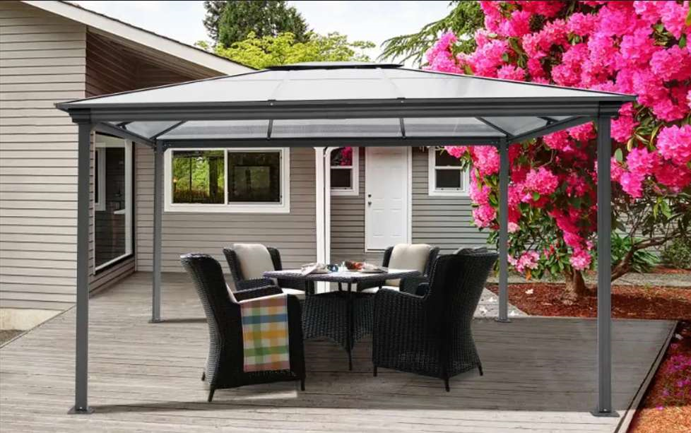 Caratteristiche: il pannello del tetto in PC protegge dal sole, dalla pioggia e dalla neve. Costruito con una robusta struttura in alluminio, con verniciatura a polvere, adatto per cortili o prati all'aperto. Viene fornito con ancore da 22x16 cm per una maggiore stabilità in tutte le stagioni.