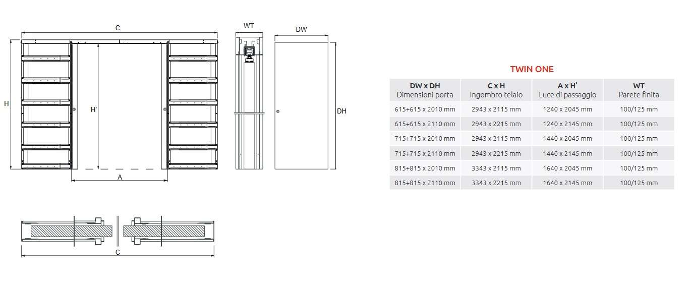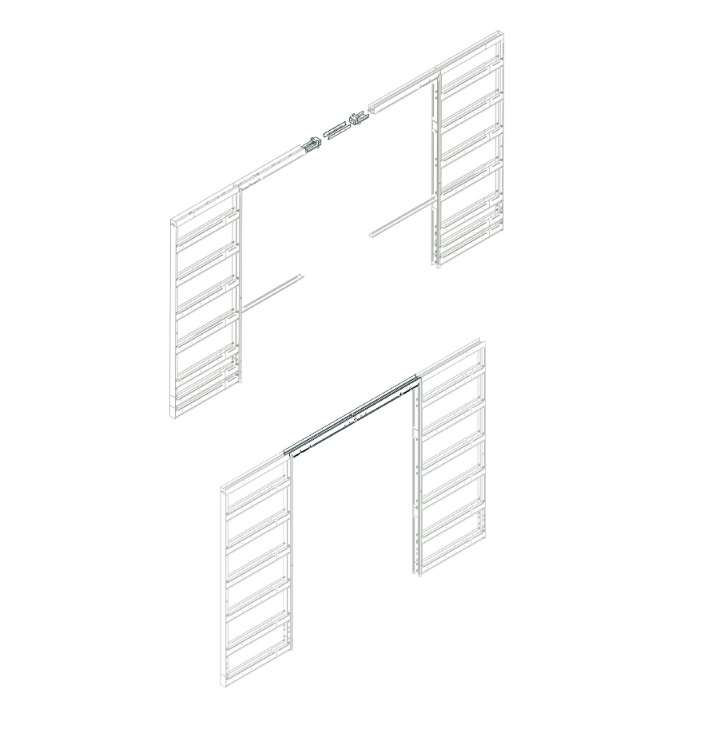Grazie a TWIN si possono unire 2 telai ONE ed ottenere un sistema di porta scorrevole a scomparsa doppia. Con l’utilizzo di una semplice dima e specifiche spine,l’accoppiamento di due controtelai risulta facile e privo di errori. Per una maggiore luce di passaggio, con tempi brevissimi di montaggio.