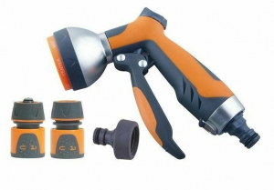 Hydro Pistola con regolazione della portata e del getto. Grilleto ergonomico con blocco automatico. Completa di 3 raccordi. Pistola da irrigazione utile e funzionale, nonchè molto comoda.
