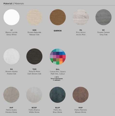 Bianco Lucido, Rovere Naturale, Quercia, Pino Artico, Rovere Cenere, Rovere Alaska, Testa di Moro, Pietra Avana, Pietra Bianca, Pietra Blu, Pietra Marrone