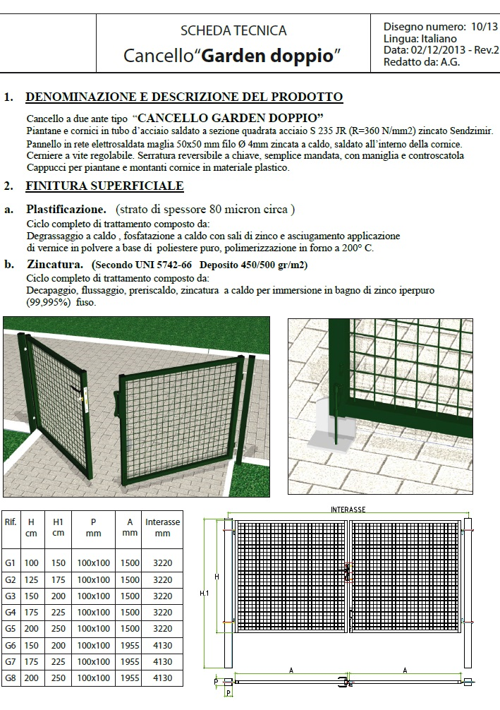 Pali di sostegno Compresi diametro: 100mm - Cancello a 2 battenti - È il tradizionale cancelletto che integra e completa la recinzione con pali e rete metallica. larghezza tot. cancello+ piantoni 325 cm circa. PRODOTTO MADE IN ITALY FINITURA: PFZ (Filo zincato + Fosfatazione ai sali di zinco + Plastificazione con poliestere): Il filo utilizzato per produrre questa rete è zincato a caldo in continuo in bagno di zinco per garantire la massima resistenza e durabilità nel tempo al prodotto. Successivamente, dopo aver assemblato il pannello, viene applicato il trattamento di Plastificazione PFZ che prevede 7 fasi di lavorazione che assicurano la migliore qualità del prodotto. La prima fase prevede il degrassaggio (1) per eliminare ogni residuo superficiale di olio, grasso e polvere. Successivamente un’ulteriore lavaggio (2) elimina altre eventuali impurità e residui del degrassaggio. A questo punto inizia il ciclo di fosfatazione : lavaggio con acqua demineralizzata (3) ed applicazione di fosfati di zinco (4). Il prodotto viene poi asciugato (5) in forno a 120° in preparazione alla successiva fase di plastificazione (6) con resine di poliestere puro al 100%. Attraverso la polimerizzazione (7) lo strato di poliestere viene fissato al supporto.