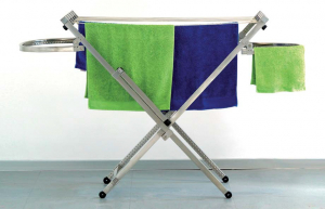 Foldable, space saving, drying clothing rack. This item is lightweight but extremly sturdy and has been designed to hold heavy garments. With two lateral supports for added space. The clothing lines are made from wire with a rubber covering and are adjustable to ensure perfect tension.