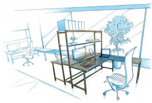 An ideal solution for a swift reorganisation of the office environment. This ergonomically designed stainless steel desk, side runner and integrated book shelf create an optimal environment for a work station with a “touch of design” provided by the blue PVC top