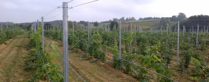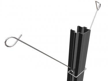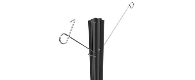 INOX: 302 / distanziatore mobile di fili doppi da incastrare al palo in metallo. servono per sostenere i fili doppi per il contenimento della vegetazione vengono aperti durante la potatura e richiusi quando i germogli hanno raggiunto una certa lunghezza. I fili restano incardinati nel distanziatore, solo la molla viene aperta e chiusa. In questo modo la maggior parte dei germogli si sviluppa dentro i due fili, i vantaggi sono un minor numero di germogli spezzati, un maggior intervallo di tempo per eseguire i lavori ed una più rapida