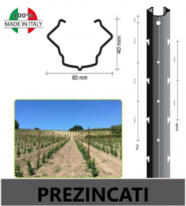 Il palo, con sezione 60x40 mm. a profilo aperto, è adatto per impianti vigneto a spalliera La sua particolare sezione e le nervature assicurano robustezza e resistenza alle normali sollecitazioni denvanti dai processi di meccanizzazione.