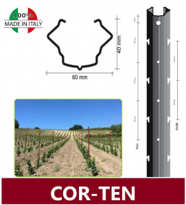 Il palo, con sezione 60x40 mm. a profilo aperto, è adatto per impianti vigneto a spalliera La sua particolare sezione e le nervature assicurano robustezza e resistenza alle normali sollecitazioni denvanti dai processi di meccanizzazione.