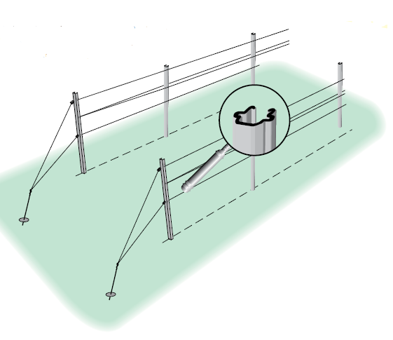 Le asole antisgancio a "N", distanziate a intervalli di 15 cm, consentono la stabilità del filo anche su terreni con cambi di livello.